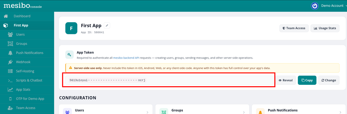 Keep this token secure. You will use it in your backend server to generate user access tokens — one per user — which are what your client apps use to authenticate with mesibo.
