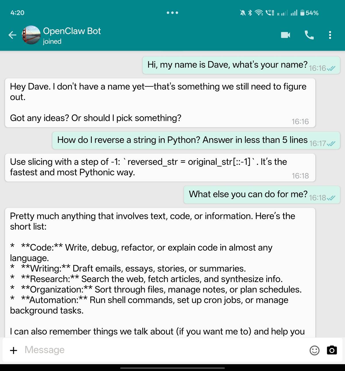 And within moments, a reply from your OpenClaw agent lands back in your app.
