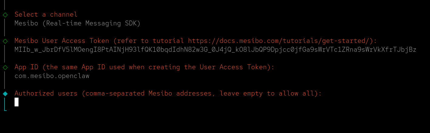 You can also configure an allow-list of authenticated mesibo users who are permitted to interact with OpenClaw, or leave it empty to allow all users, which is fine for initial testing.